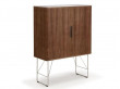 High cabinet with solid wood curtain doors and bar fittings. 1 internal glass shelf and 1 bottle rack in white Corian. 2 internal wooden drawers. Stainless steel handles. Top in white Corian. Feet in brushed stainless steel wire. Available in Ash, oak, or walnut.