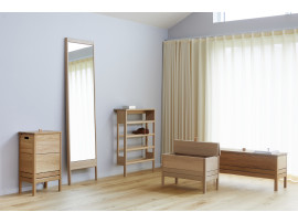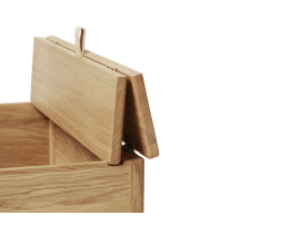 It is practical with a large area for storage – consisting of two separated compartments. The lid is lifted via a small leather handle and the construction holds the lid in place while used.