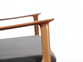 Characteristic of Ole Wanscher's design is a quest for slim dimensions and resilient forms. His chairs often employ both slender and slightly curved armrests, which rise in an elegant tip before continuing directly to the floor; as is the case with his well known 'Colonial Chair'. Classic and yet singularly modern at the same time.