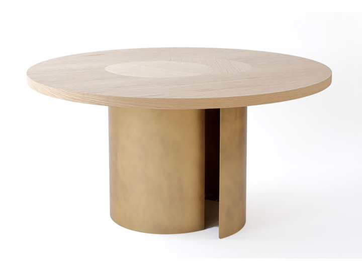 Its bronze lacquered metal base or patinated brass finish gives the piece a sculptural and elegant presence. The oak veneer top, enhanced with a central decorative detail, showcases the natural beauty of wood while adding a refined graphic touch.