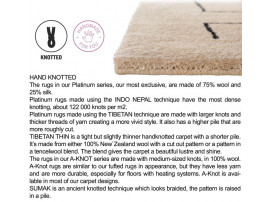 Hand knotted in the highest quality possible. Indo Nepal quality: with a very fine and tight coat.