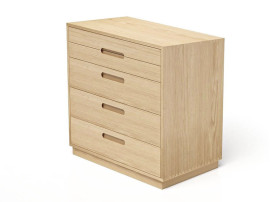 The cabinet and drawers are made of solid ash, oak or walnut, either oiled or covered with a water-resistant matte clear varnish. The interior of the drawers is made of solid ash wood. The joints are made with dovetail connections using environmentally friendly non-toxic glues. The varnishes are water-based and non-polluting, and the oil used is organic and vegetable-based. The base is made of satin-finished lacquered steel, available in black, white, or a range of twenty colors from the RAL palette (contact us). The legs can be finished with solid wood caps of the same species as the cabinet or with black plastic glides.