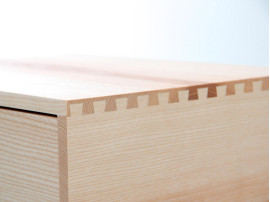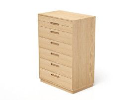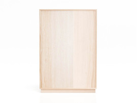 The cabinet and drawers are made of solid ash, oak or walnut, either oiled or covered with a water-resistant matte clear varnish. The interior of the drawers is made of solid ash wood. The joints are made with dovetail connections using environmentally friendly non-toxic glues. The varnishes are water-based and non-polluting, and the oil used is organic and vegetable-based. The base is made of satin-finished lacquered steel, available in black, white, or a range of twenty colors from the RAL palette (contact us). The legs can be finished with solid wood caps of the same species as the cabinet or with black plastic glides.