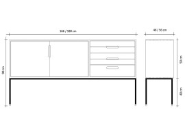 | Dimensions | Total height: 90 cm. Depth: 46 cm to 56 cm. Width: from 166 cm to 180 cm. Cabinet: Height 50 cm. Large drawers: Interior height: 15 cm. Small drawers: Interior height: 6.7cm. Base height: 40 cm |