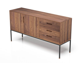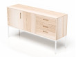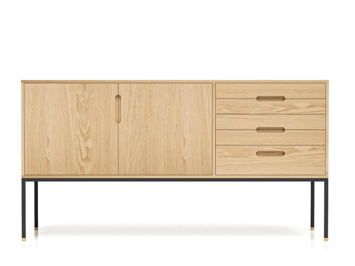 The cabinet and drawers are made of solid ash, oak or walnut, either oiled or covered with a water-resistant matte clear varnish. The interior of the drawers is made of solid ash wood. The joints are made with dovetail connections using environmentally friendly non-toxic glues. The varnishes are water-based and non-polluting, and the oil used is organic and vegetable-based. The base is made of satin-finished lacquered steel, available in black, white, or a range of twenty colors from the RAL palette (contact us). The legs can be finished with solid wood caps of the same species as the cabinet or with black plastic glides.