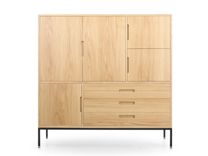 The cabinet and drawers are made of solid ash, oak or walnut, either oiled or covered with a water-resistant matte clear varnish. The interior of the drawers is made of solid ash wood. The joints are made with dovetail connections using environmentally friendly non-toxic glues. The varnishes are water-based and non-polluting, and the oil used is organic and vegetable-based. The base is made of satin-finished lacquered steel, available in black, white, or a range of twenty colors from the RAL palette (contact us). The legs can be finished with solid wood caps of the same species as the cabinet or with black plastic glides.