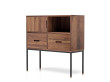 The cabinet and drawers are made of solid ash, oak or walnut, either oiled or covered with a water-resistant matte clear varnish. The interior of the drawers is made of solid ash wood. The joints are made with dovetail connections using environmentally friendly non-toxic glues. The varnishes are water-based and non-polluting, and the oil used is organic and vegetable-based. The base is made of satin-finished lacquered steel, available in black, white, or a range of twenty colors from the RAL palette (contact us). The legs can be finished with solid wood caps of the same species as the cabinet or with black plastic glides.