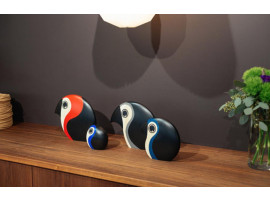 Hans Bølling created Discus in 1961. The birds are shaped as a discus and are made in hand painted pinewood. The painted parts represent the colorful plumage of the bird, whereas the chest of the bird remains unpainted; revealing the natural qualities of the wood. The beautiful veins of the wood contrast the painted parts of the birds. The birds come in a family consisting of four members that can be placed in line in the window or on a shelf.