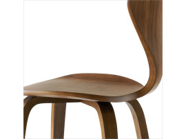 The molded plywood Side chair by Norman Cherner, dating back to 1958, is the perfect companion to the classic Cherner armchair. Ideal as a dining chair, it is both lightweight and sturdy, designed to be passed down from generation to generation. Its shell is made from multi-ply wood of varying thicknesses, ranging from 15 to 5 plies for the thin edges of the shell. Produced according to the original drawings and molds, the Cherner Side chair is entirely made in the United States. It is available in several finishes: walnut, beech, ebony, Stella orange, and lacquered white. A matching armchair is also available.