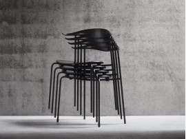 The steel frame, with straight back legs, supports an oval-shaped wooden seat. This blend of materials, combined with a minimalist design, results in a light, organic, industrial expression. And the new, stackable design offers a valuable benefit.
