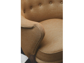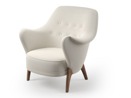 Elegant lounge chair with an embracing, organic design that combines classic virtues with a warm personality. The chair was designed in 1953 by the renowned Danish furniture designer Arne Hovmand-Olsen, who became known for innovative furniture in Scandinavian style. With the Cocktail chair, you get original design in the most beautiful processing for your favorite corner in the living room, bedroom or office, just as the lounge chair will dress up a sofa arrangement. The rich padding creates fullness and, together with the buttons, draws references to the 50s, while the exclusive textile choice brings the design into the present. The angled legs make the chair lift elegantly from the floor as a counterweight to the soft heaviness of the upholstery, while the fine curved armrests and rounded details emphasize a soft and feminine expression. The refined armrests complete the design and invite you to rest nonchalantly in the arms of the chair. For extra comfort, a classic footstool in the same elegant design is available to rest your feet on while you enjoy a cold drink or read the newspaper.