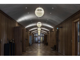 Poul Henningsen designed his first lights back in 1925-1926 for an exhibition in Paris. His work with Louis Poulsen continued right up until his death in 1967. Throughout his life, PH sought to create glare-free light, direct light where it was most needed, and create soft shadows, using incandescent bulbs as a light source. PH Louvre was designed for the Adventist Church in Skodsborg, Denmark in 1957. The globe-shaped fixture is made up of 13 shades mounted on four supports. It is a simplification of an earlier light Poul Henningsen designed in 1942, called the Spiral.