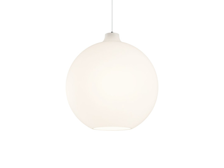 Mouth-blown matt white opal glass shade with brushed steel suspension.