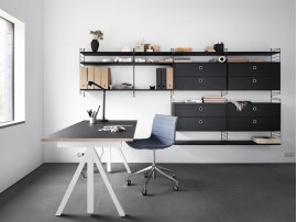 The String Shelving System consist in various basic elements – amounts, desk, shelves, cases, folding table – that you can conbine according to individual needs, and characteristics of each space, even professionnal.