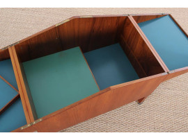 Scandinavian teak bar cube, by : Leif Alring, mounted on castors. Interior with blue and green formika, side with drawer. No key.
