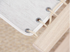 Consisting of a beech or oak plywood structure and a stretched canvas covered with a leather cushion.