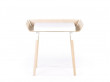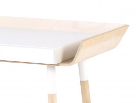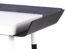 While developing the idea of the My Writing Desk (MWD), designer Inesa Malafej had a clear goal : to reduce the chaotic clutter. The result is a desk which has its storage space organized around the table-top, where the objects are always in sight and easily accessible. This enlarges the desktop beyond its edges without the worry that things might fall down. Furthermore, any unnecessary objects can simply be pushed to the sides, for storage. The wings are divided, leaving space for the electrical wires. MWD features one or two drawers, to store a laptop and other working tools. The legs of the table can be twisted off for easier transportation. MWD is Inesa’s graduation project from the Vilnius Academy of Arts. Two finishes available: Natural birch structure / white laquered MDF top or Black stained ash structure / white laquered MDF top.