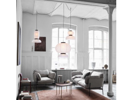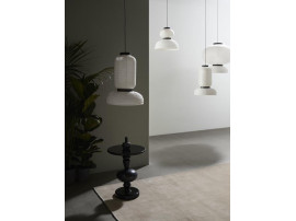 East meets West in Jaime Hayon’s playful tweak of a traditional Asian lantern in contemporary expression. Dating back centuries, paper lanterns have featured in Asia amongst the privileged and the poor, where different colours, shapes and sizes connote different meanings. Here Hayon has dispensed with cultural formalities to create a series of lamps all in white. Hand crafted with rice paper merging various sizes and shapes together. The series is comprised of three different lantern versions and a table lamp in ivory white rice paper with black stained oak accents.