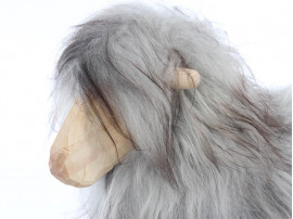 Sheep in pine, hand carved by the Danish sculptor Povl Kjer and covered with a lambskin from Norway. Each skin is different and retains its natural shade. Each rocking sheep is therefore unique.