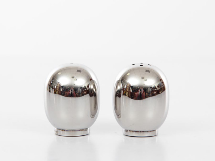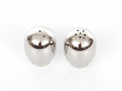 Set of 2 salt and pepper Super Egg shakers by Piet Hein. New edition. With Piet Hein's elegant salt and pepper shakers in moulded stainless steel you will never be without salt or pepper for your egg. The shakers are shaped after Piet Hein's popular super-egg and is not only handy but also a stylish object to have on your dinner table.