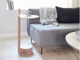A mobile and versatile side table. The table is visually very light as the tabletop is only mounted on one leg and therefore seems to hover in the air. The slightly built tabletop has three different height settings regulated by a brass rod. This renders it suitable as a side table for a sofa or armchair, as a bedside table or simply as a freestanding table.