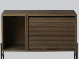 Hifive Storage Units. 75 cm. Floor. This swanky shelving and storage system is as cool as they come; it greets everyone with a hi-five. The system is comprised of streamlined modular components: an open unit, a cabinet with a scrolling door, a sleek metal base and a wooden top that unites the units with a single surface. If no base is required, the units can be mounted directly to the wall. The cabinet is designed to hold equipment such as receivers, amps and multimedia players. Its scrolling door closes to conceal the contents, hiding the electronics behind a flexible wooden screen. The open unit is sized to accommodate old-school vinyl LPs but can store music and television media too. The units are available in a smoked oak veneer, black painted oak veneer and light-coloured oiled oak veneer. Contemporary in expression and practical in scope, Hifive can provide storage for a range of items.