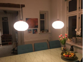 The lights share characteristic features, a slightly flattened round lampshade, and a walnut detail for the pendant lights and legs of the same wood for the table and floor lamps.
