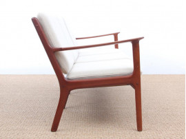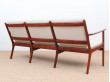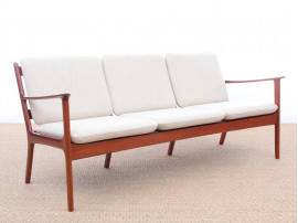 Banquette scandinave 3 places modèle PJ112 en teck de Ole Wanscher pour Poul Jepesen. Coussins refaitss à neuf (housses et mousses) en tissu Kvadrat Hallingdal. Référencée par le Design Museum Danmark sous le numéro : RP02694.