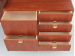 Bibliothèque modulable BO71 en teck de Finn Juhl pour Bovirke dans les années 1960. Composé de 3 colonnes, 4 crémaillères, 1 caisson à 6 tiroirs, un écritoire, 13 étagères en pin de l’Oregon, 22 presse-livres en laiton. Système d’équerres en laiton.