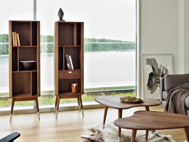 Rangement bibliothèque en bois massif. 2 etagères interieures. Embouts des pieds en acier inoxydable. Dessus plaqués de Corian blanc. Disponible en Frêne, chêne, ou noyer.