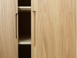Le caisson et les tiroirs sont en coeur de frêne, en chêne ou en noyer massif huilé ou recouverts d’un verni incolore mat résistant à l’eau. L’intérieur des tiroirs est en cœur de frêne massif. Les assemblages sont réalisés à queue-d’arondes, avec des colles écologiques non polluantes. Les vernis sont à l’eau et non pullulants, l’huile est végétale et biologique. Le piètement est en acier laqué satiné, disponible en noir, en blanc ou dans une vingtaine de coloris de la gamme RAL (sur demande). Les pieds se terminent, au choix, par des embouts en bois massif de la même essence que le caisson où par des patins en plastique noir.
