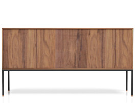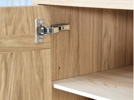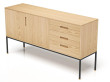Le caisson et les tiroirs sont en coeur de frêne, en chêne ou en noyer massif huilé ou recouverts d’un verni incolore mat résistant à l’eau. L’intérieur des tiroirs est en cœur de frêne massif. Les assemblages sont réalisés à queue-d’arondes, avec des colles écologiques non polluantes. Les vernis sont à l’eau et non pullulants, l’huile est végétale et biologique. Le piètement est en acier laqué satiné, disponible en noir, en blanc ou dans une vingtaine de coloris de la gamme RAL (sur demande). Les pieds se terminent, au choix, par des embouts en bois massif de la même essence que le caisson où par des patins en plastique noir.