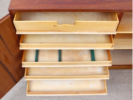 Buffet scandinave à 2 portes de Borge Mogensen pour FDB. En teck et piètement en chêne. Intérieur en hêtre et pin. Etagères et tiroir modulables.