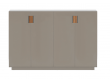 Deux portes coulissantes / pliantes, poignées en cuir, un séparateur et quatre tablettes laquées.