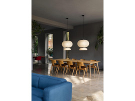 La structure en hêtre massif est découpée à l'aide d'une machine à commande numérique. L'assise, le dossier et les supports de dossier sont fabriqués en pressant des couches de placage stratifié avec de la colle, puis découpés dans leur forme finale à l'aide d'une machine à commande numérique. L'ensemble de la chaise est ensuite poncé et le cadre est collé.