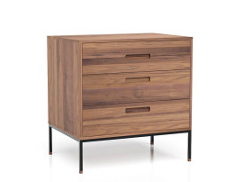 Le caisson et les tiroirs sont en coeur de frêne, en chêne ou en noyer massif, sont huilés ou recouverts d’un vernis incolore mat résistant à l’eau. L’intérieur des tiroirs est en cœur de frêne massif. Les assemblages sont réalisés à queue-d’arondes, avec des colles écologiques non polluantes. Les vernis sont à l’eau et non pullulants, l’huile est végétale et biologique. Le piètement est en acier laqué satiné, disponible en noir, en blanc ou dans une vingtaine de coloris de la gamme RAL (sur demande). Les pieds se terminent, au choix, par des embouts en bois massif de la même essence que le caisson où par des patins en plastique noir.