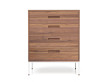 Le caisson et les tiroirs sont en coeur de frêne, en chêne ou en noyer massif, sont huilés ou recouverts d’un vernis incolore mat résistant à l’eau. L’intérieur des tiroirs est en cœur de frêne massif. Les assemblages sont réalisés à queue-d’arondes, avec des colles écologiques non polluantes. Les vernis sont à l’eau et non pullulants, l’huile est végétale et biologique. Le piètement est en acier laqué satiné, disponible en noir, en blanc ou dans une vingtaine de coloris de la gamme RAL (sur demande). Les pieds se terminent, au choix, par des embouts en bois massif de la même essence que le caisson où par des patins en plastique noir.