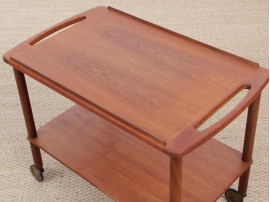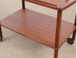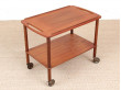 Desserte scandinave à roulette en teck à deux plateaux. Deux poignées. Petit retour sur le plateau superieur.