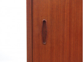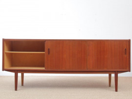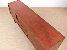 Enfilade scandinave en teck de Nils Jonsson pour Troeds Furniture. 5 grands tiroirs au centre et portes coulissantes ouvrant sur une étagère réglable en hauteur.