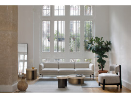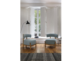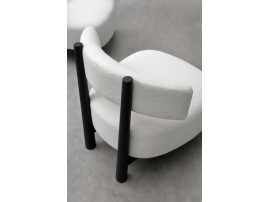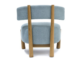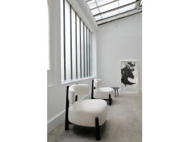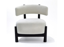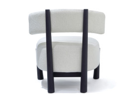 Fauteuil avec accoudoirs, structure en chêne massif naturel, ou frêne massif noir. Assise et dossier en mousse polyuréthane de différentes densités, recouverts de tissu.