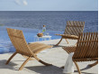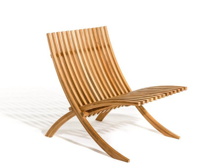 Fauteuil scandinave modèle Nozib. Un duo extravagant: une chaise longue spectaculaire composée de 88 pièces en teck méticuleusement assemblées. Le fauteuil de salon en teck n'est pas en reste avec son aspect unique, quoiqu'un peu plus conventionnel. Les deux modèles se plient et se déplient facilement.