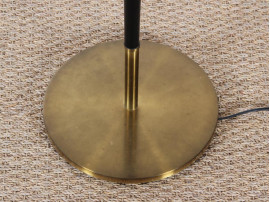 Grand lampadaire scandinave en teck, hêtre laqué et laiton. Abat-jour d'origine Le Kint. Système électrique refait à neuf et remis aux normes. Fontionne avec des ampoules standard E27.