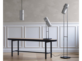 De par son design strict, le lampadaire Trombone donne du caractère à son environnement. L'abat-jour du lampadaire se compose d'un simple cylindre en métal, avec des fentes verticales étroites percées au-dessus et au-dessous, qui permettent à la lumière de traverser le métal et d'éclairer le luminaire. En combinaison avec l'intérieur blanc du cylindre, il crée un effet lumineux d'une beauté unique, et la lumière peut être contrôlée selon les besoins en déplaçant la tête de lampe orientable vers le haut ou vers le bas. Le cylindre s'équilibre élégamment entre deux fines tiges métalliques reliées par une seule barre transversale - une expression de design qui rappelle un projet de trompette et a inspiré le nom de la lampe - tandis que la base carrée souligne le design géométrique serré. En plus du lampadaire, la série Trombone comprend également une lampe de table et une suspension, qui sont disponibles en laiton brossé ou en aluminium brossé et témoignent de l'amour de Jo Hammerborg pour les métaux.