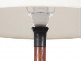 Lampe de table scandinave en teck massif tourné et gainage de cuir noir. Système électrique refait à neuf et remis aux normes. Fonctionne avec des ampoules standard E27. Vendue sans abat-jour.
