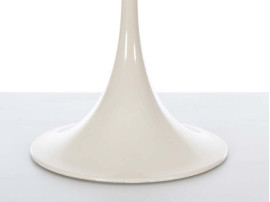 Conçue en 1971 par Verner Panton et toujours produite par le même éditeur Louis Poulsen. Panthella est l’une des créations les plus célèbres de Verner Panton. Le principe d’éclairage de base visait à créer une lampe dont la base et l’abat-jour faisait office de réflecteur. La source lumineuse des lampes est cachée derrière un abat-jour hémisphérique en acrylique blanc laiteux et une base blanche en forme de trompette contribue à une superbe distribution de la lumière ainsi qu’à une forme bien équilibrée. La lampe de table possède un abat-jour légèrement plus petit pour apporter un design plus adapté au placement sur une table. Plusieurs versions ont été produites dans les premiers temps, mais Panthella avec un abat-jour et une base blancs est la seule édition encore en production. « Le but principal de mon travail est d’inciter les gens à utiliser leur imagination » - Verner Panton.