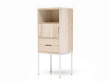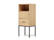 Le caisson et les tiroirs sont en coeur de frêne, en chêne ou en noyer massif, sont huilés ou recouverts d’un vernis incolore mat résistant à l’eau. L’intérieur des tiroirs est en cœur de frêne massif. Les assemblages sont réalisés à queue-d’arondes, avec des colles écologiques non polluantes. Les vernis sont à l’eau et non pullulants, l’huile est végétale et biologique. Le piètement est en acier laqué satiné, disponible en noir, en blanc ou dans une vingtaine de coloris de la gamme RAL (sur demande). Les pieds se terminent, au choix, par des embouts en bois massif de la même essence que le caisson où par des patins en plastique noir.