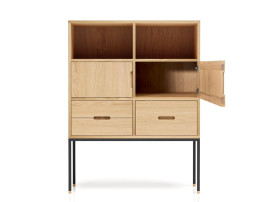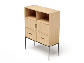 Le caisson et les tiroirs sont en coeur de frêne, en chêne ou en noyer massif, sont huilés ou recouverts d’un vernis incolore mat résistant à l’eau. L’intérieur des tiroirs est en cœur de frêne massif. Les assemblages sont réalisés à queue-d’arondes, avec des colles écologiques non polluantes. Les vernis sont à l’eau et non pullulants, l’huile est végétale et biologique. Le piètement est en acier laqué satiné, disponible en noir, en blanc ou dans une vingtaine de coloris de la gamme RAL (sur demande). Les pieds se terminent, au choix, par des embouts en bois massif de la même essence que le caisson où par des patins en plastique noir.