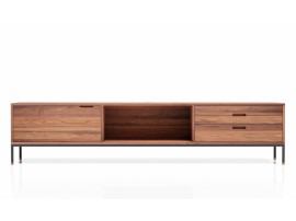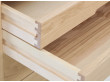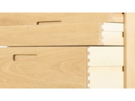 Le caisson et les tiroirs sont en chêne ou en noyer massif huilé ou recouverts d’un verni incolore mat résistant à l’eau. L’intérieur des tiroirs est en cœur de frêne massif. Les assemblages sont réalisés à queue-d’arondes, avec des colles écologiques non polluantes. Les vernis sont à l’eau et non pullulants, l’huile est végétale et biologique. Le piètement est en acier laqué satiné, disponible en noir, en blanc ou dans une vingtaine de coloris de la gamme RAL (sur demande). Les pieds se terminent, au choix, par des embouts en bois massif de la même essence que le caisson où par des patins en plastique noir.