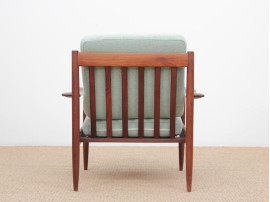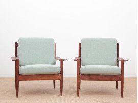 Paire de fauteuils scandinaves en teck. Les assises seront refaites avec le tissu ou cuir de votre choix parmi la gamme Step Mélange de Gabriel. Autres références de tissu avec supplément. Le prix inclut la rénovation.