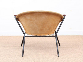 Paire de fauteuils scandinaves modèle Balloon de Hans Olsen. Structure en acier laqué noir. Assise en cuir retourné. Accoudoirs en teck. Etat exceptionnel. Prix pour la paire.